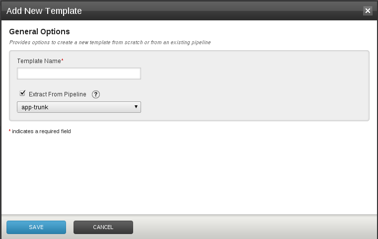 Clicking on the "Add New Template" brings up the following form which allows you to create a fresh template, or extract it from an existing pipeline. Once saved, the pipeline indicated will also start using this newly created template.